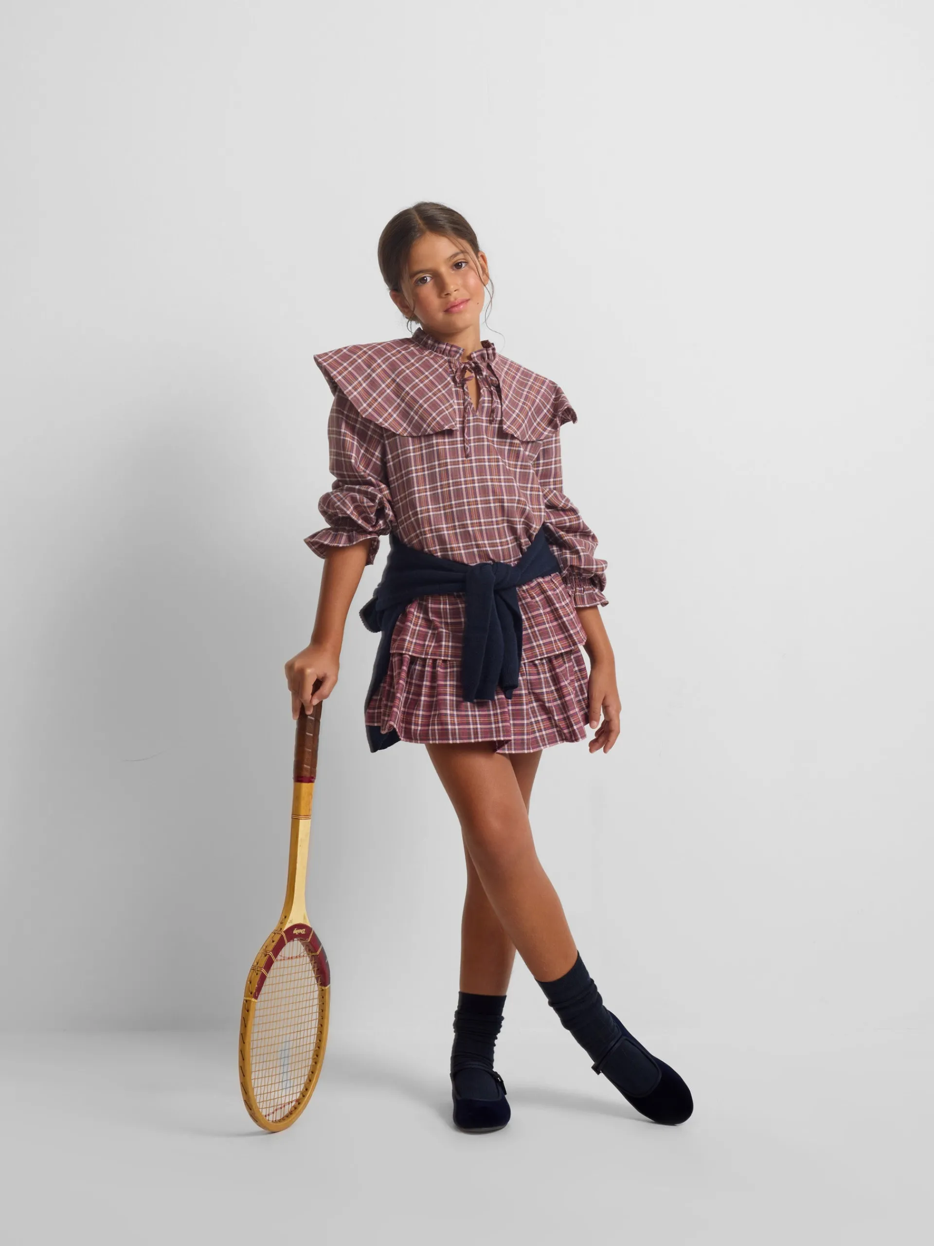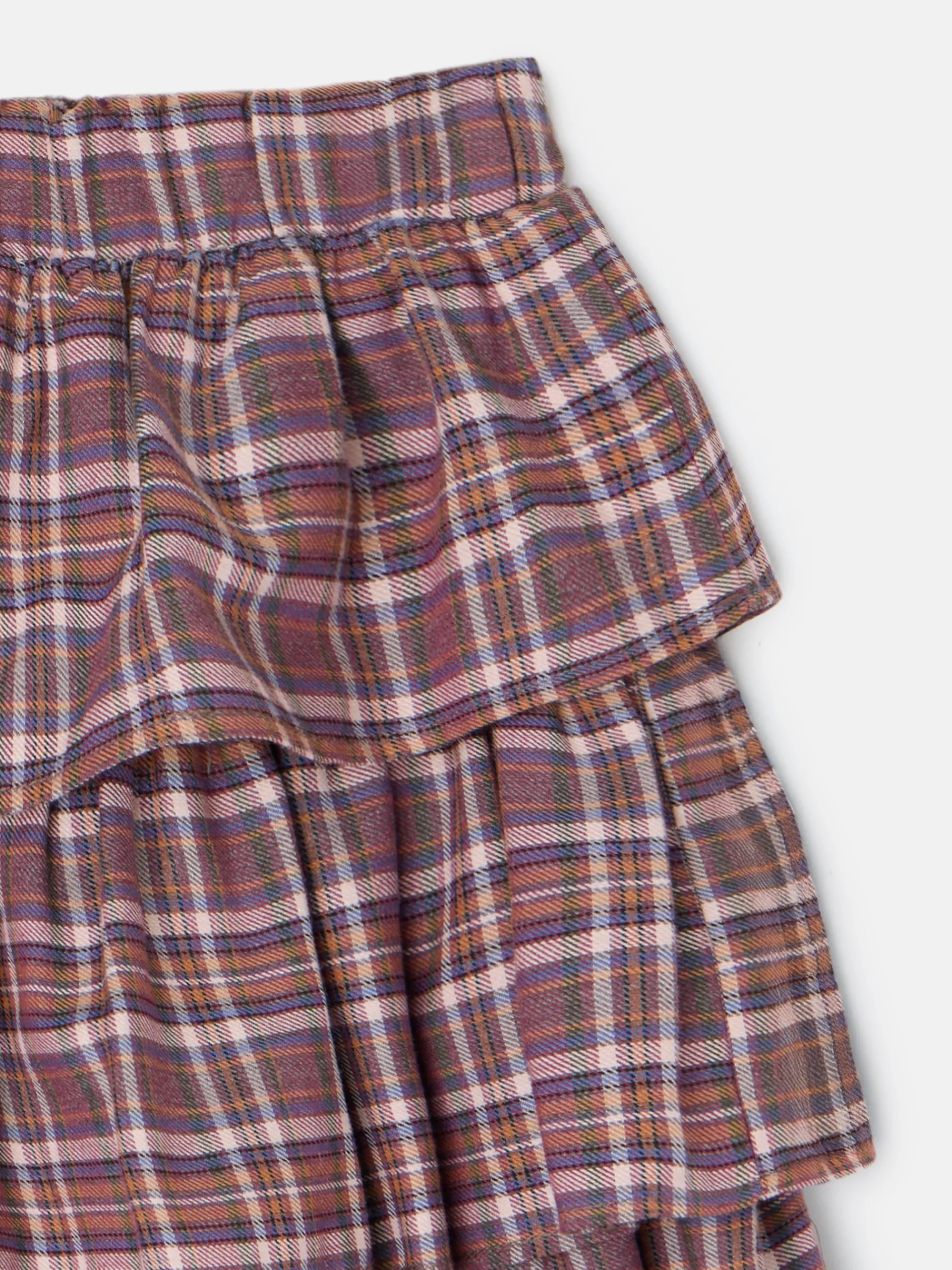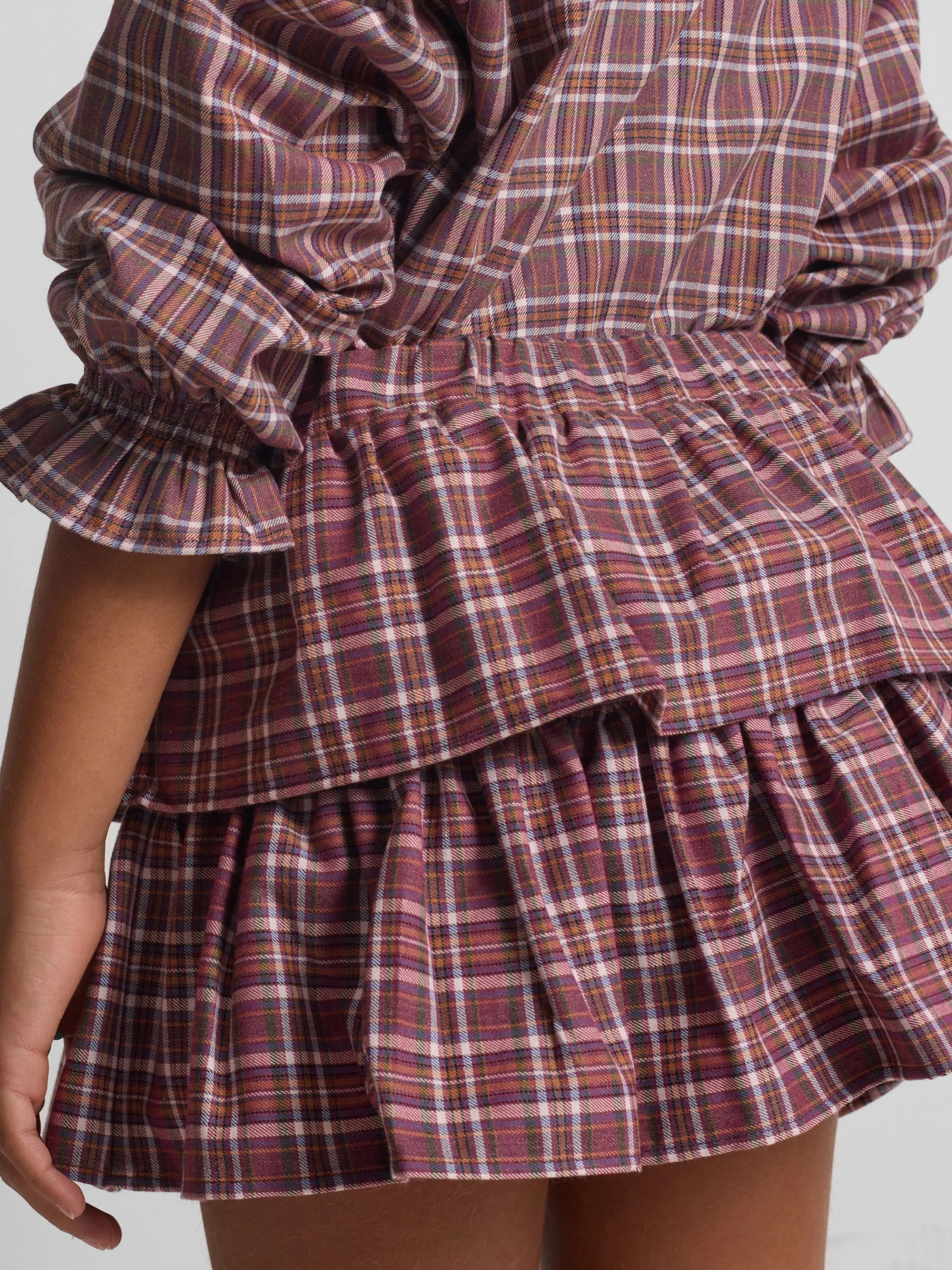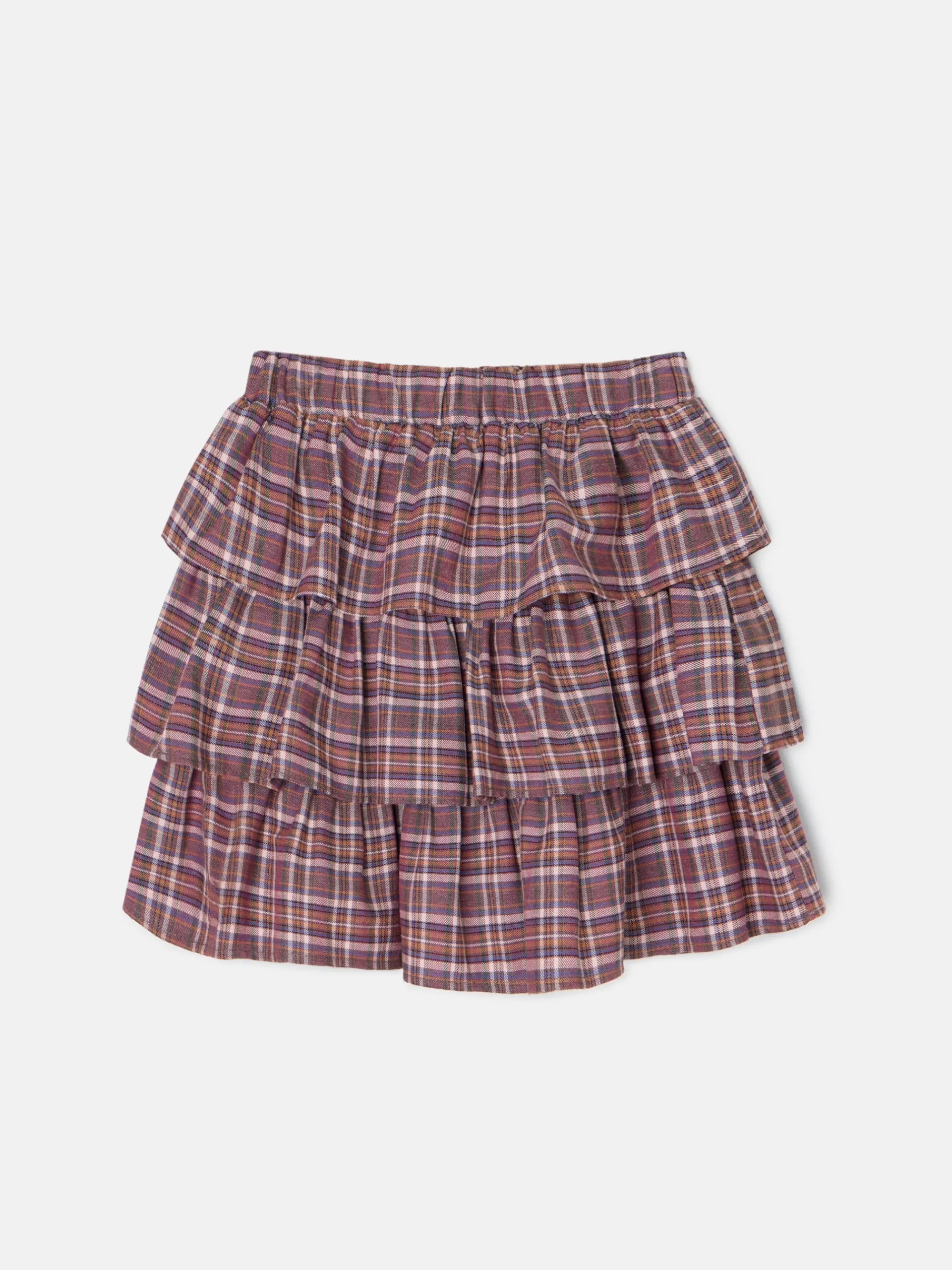 Falda de girl corta con volantes estampada con cuadros en tonos morados y rosas. Confeccionada en mezcla de algodón. Cuenta con cinturilla elástica y forro en rosa claro. Fabricada en España. Disponible blusa a conjunto.