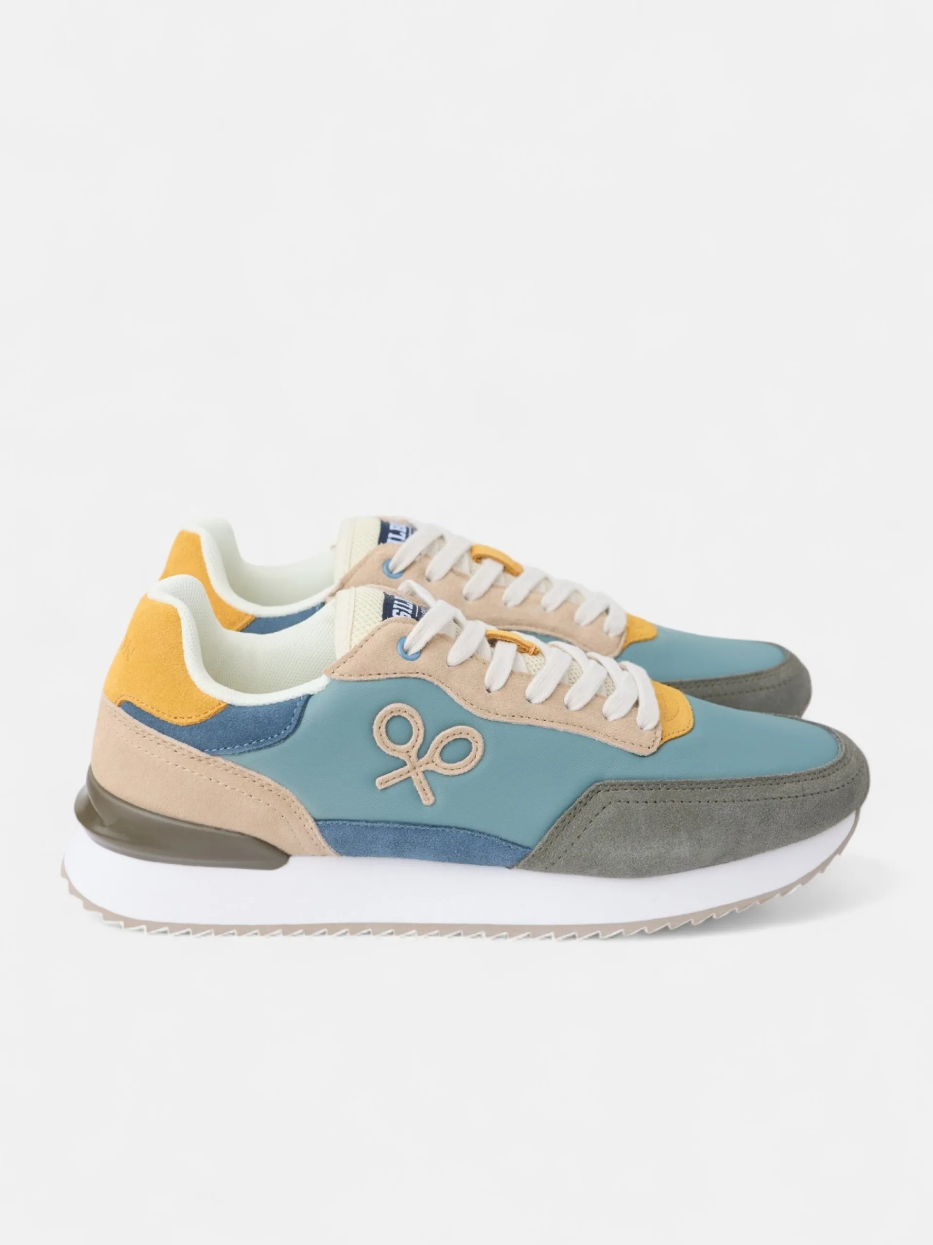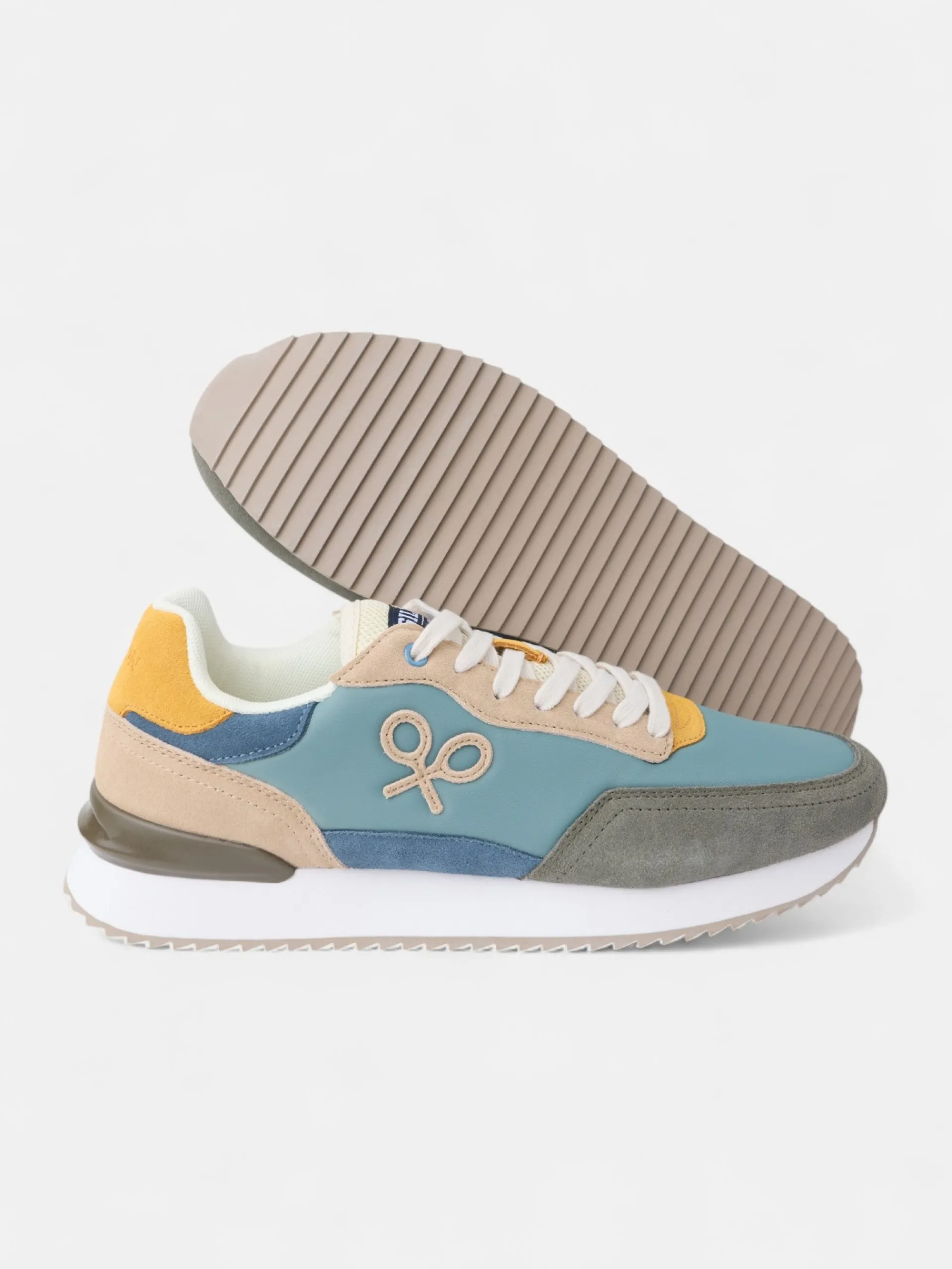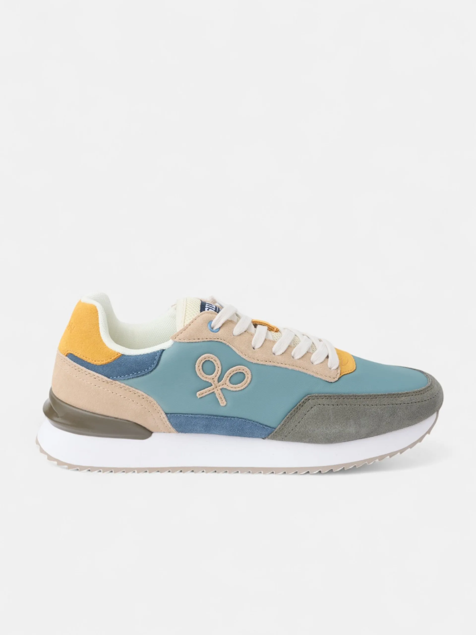 Zapatilla running multicolor en tonos verdes, azules y amarillos confeccionada en piel de serraje y tejido técnico perforado. Presenta aplique de raqueta lateral y cierre con cordones personalizados. Cuenta con suela de goma confortable, interior en piel suave y etiqueta personalizada en lengüeta.