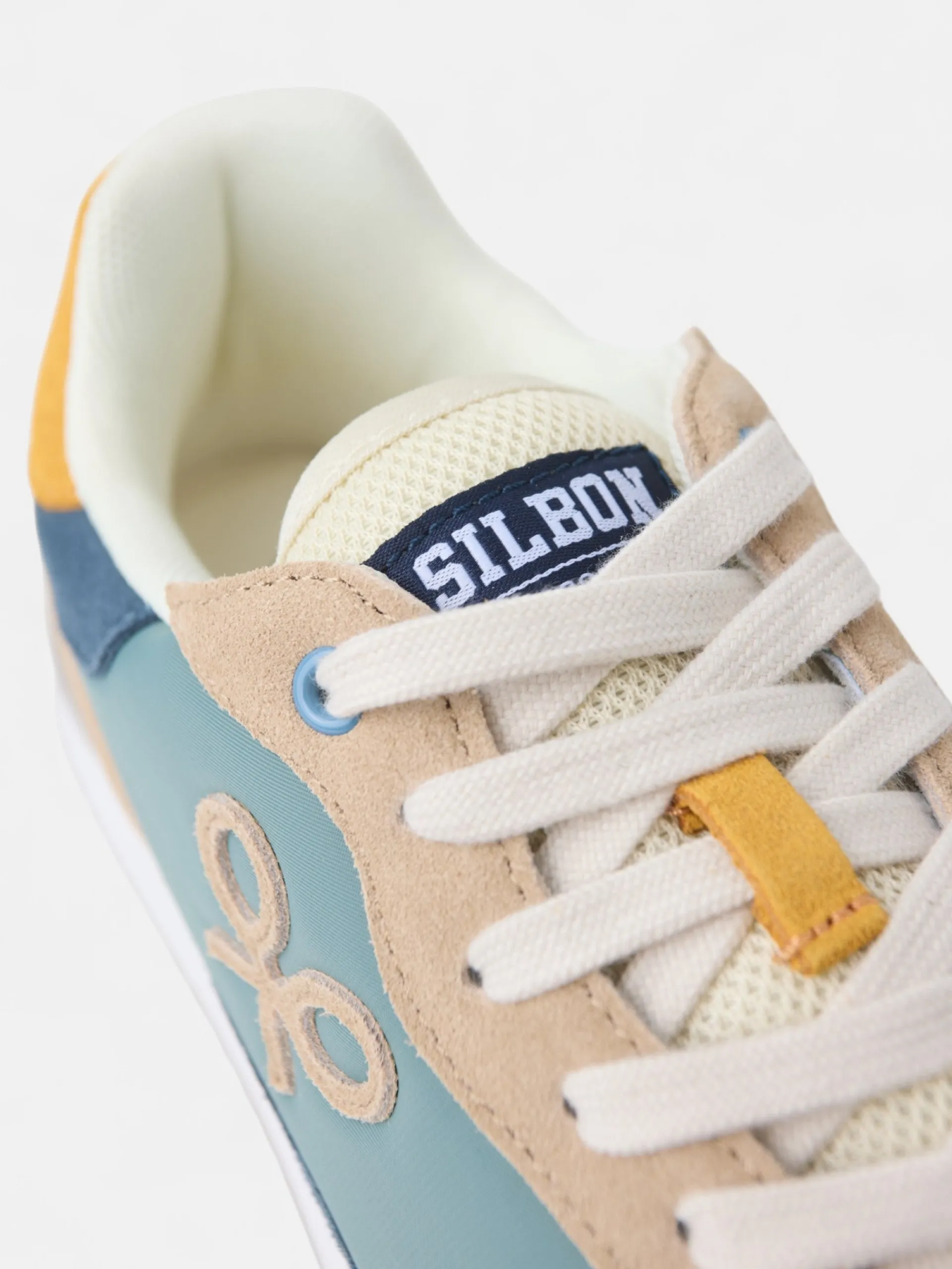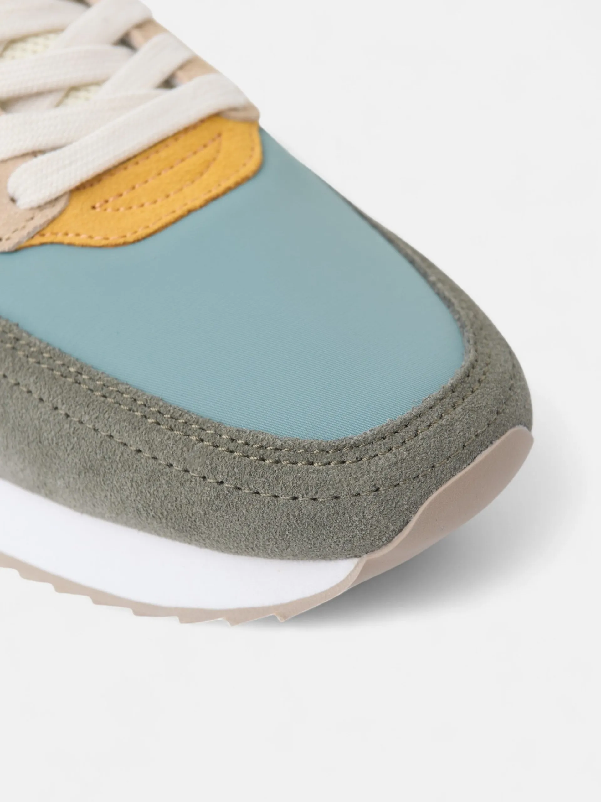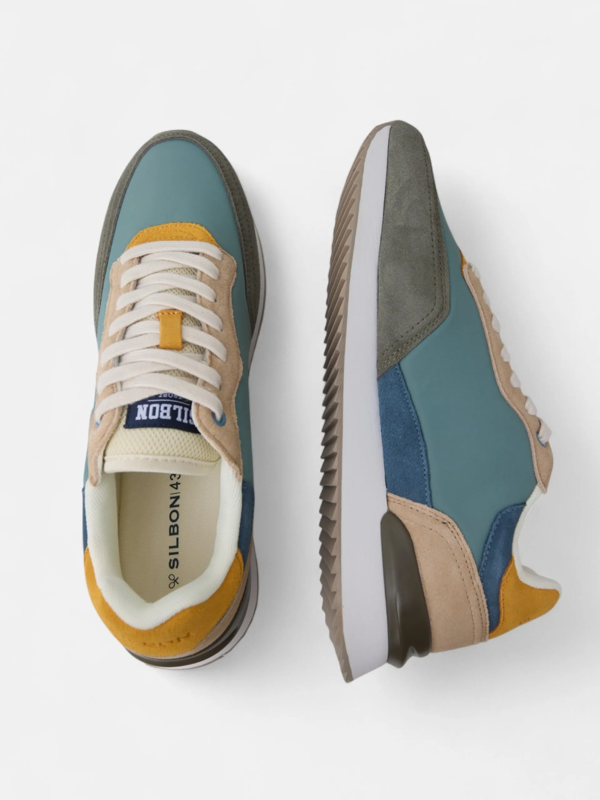 Zapatilla running multicolor en tonos verdes, azules y amarillos confeccionada en piel de serraje y tejido técnico perforado. Presenta aplique de raqueta lateral y cierre con cordones personalizados. Cuenta con suela de goma confortable, interior en piel suave y etiqueta personalizada en lengüeta.