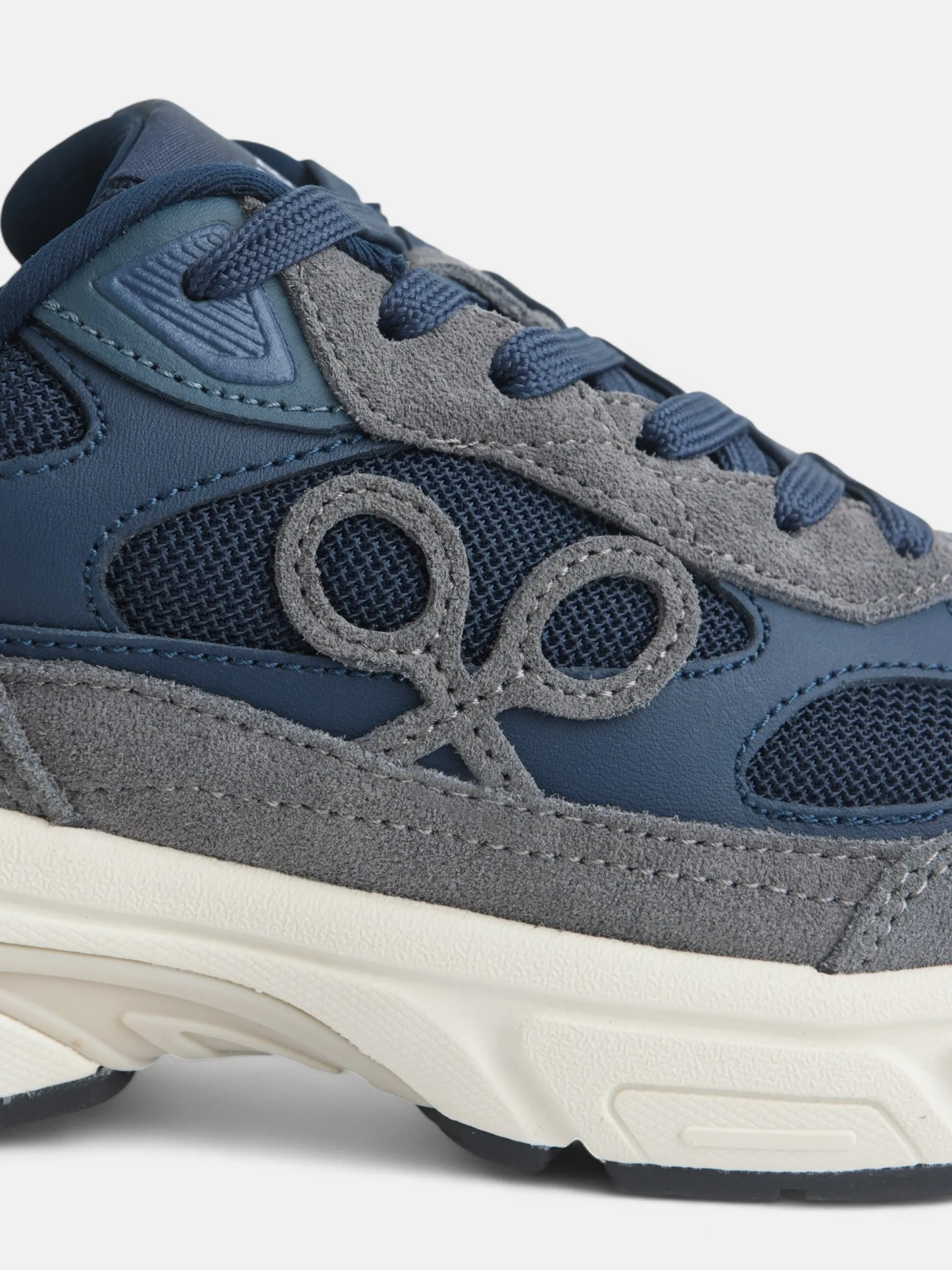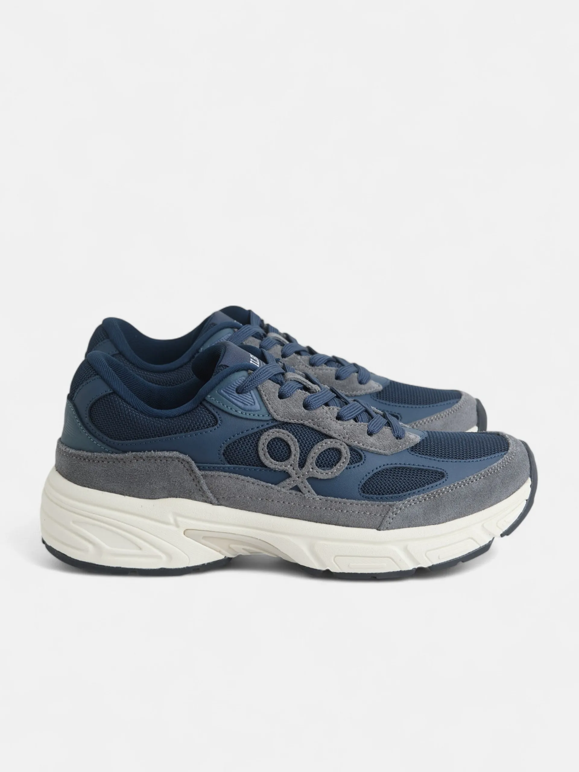 Zapatilla running en tonos azules confeccionada en piel de serraje y tejido técnico perforado. Presenta aplique de raqueta lateral y cierre con cordones. Cuenta con suela de goma confortable, interior en piel suave, etiqueta personalizada en lengüeta.