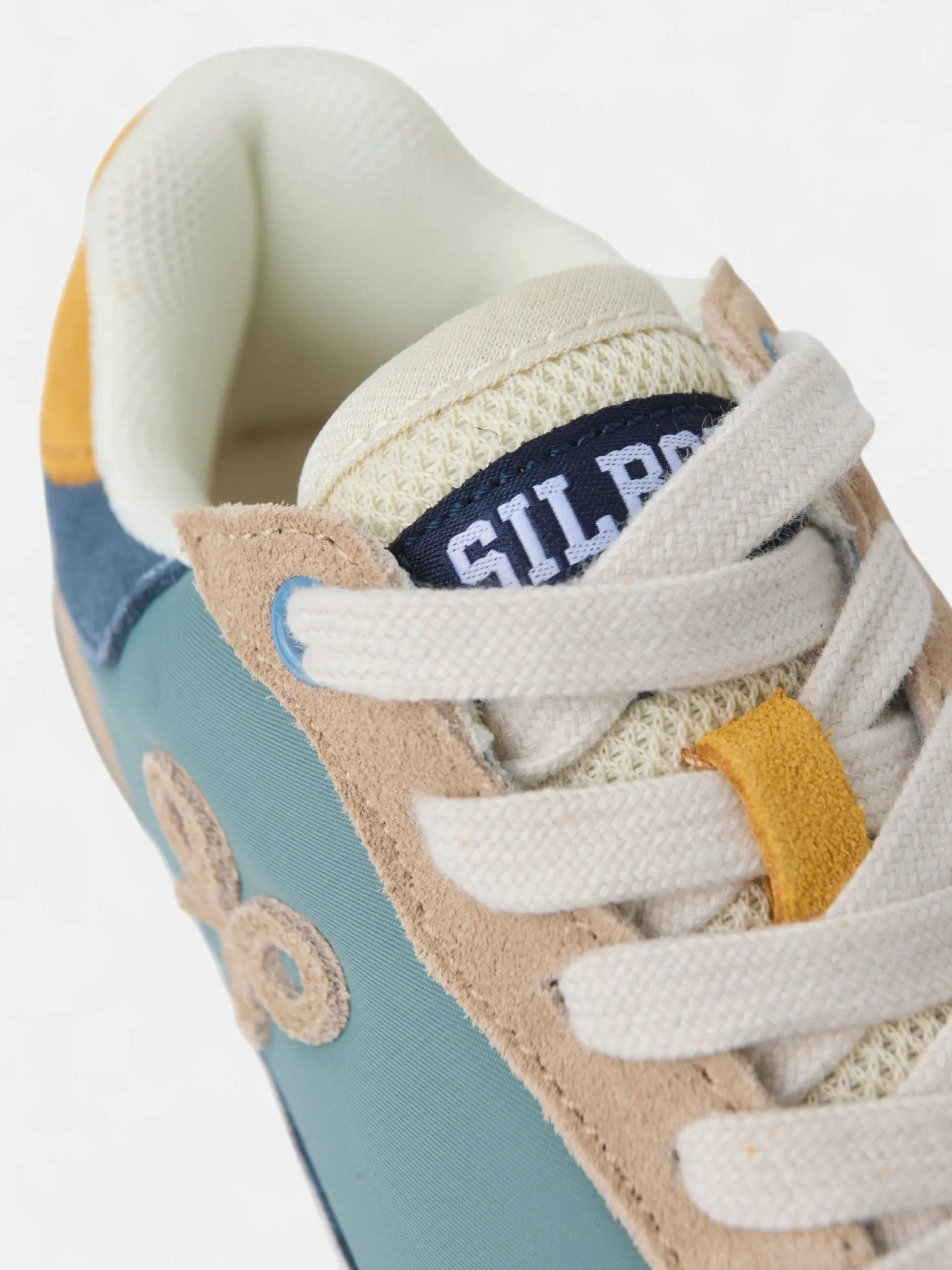 Zapatilla kids running multicolor en tonos verdes, azules y amarillos confeccionada en piel de serraje y tejido técnico perforado. Presenta aplique de raqueta lateral y cierre con cordones personalizados. Cuenta con suela de goma confortable, interior en piel suave y etiqueta personalizada en lengüeta.