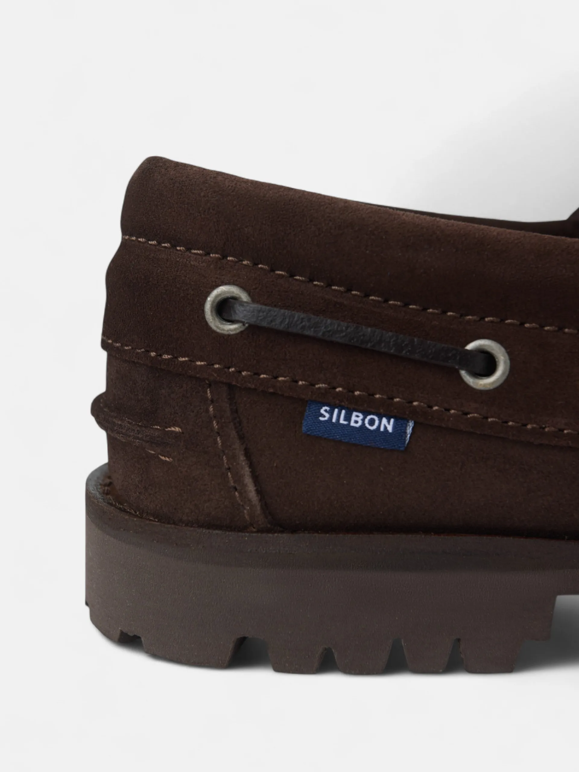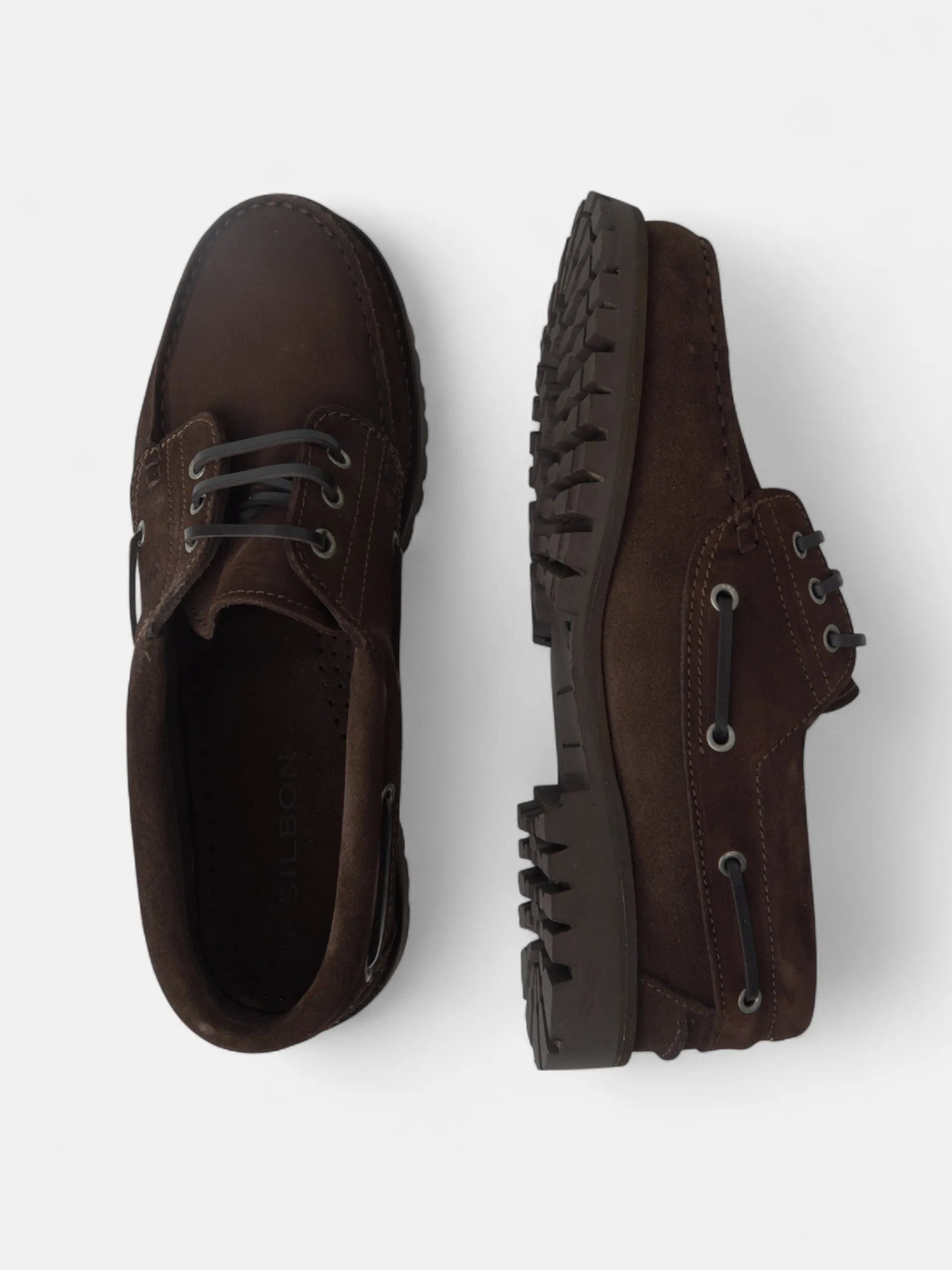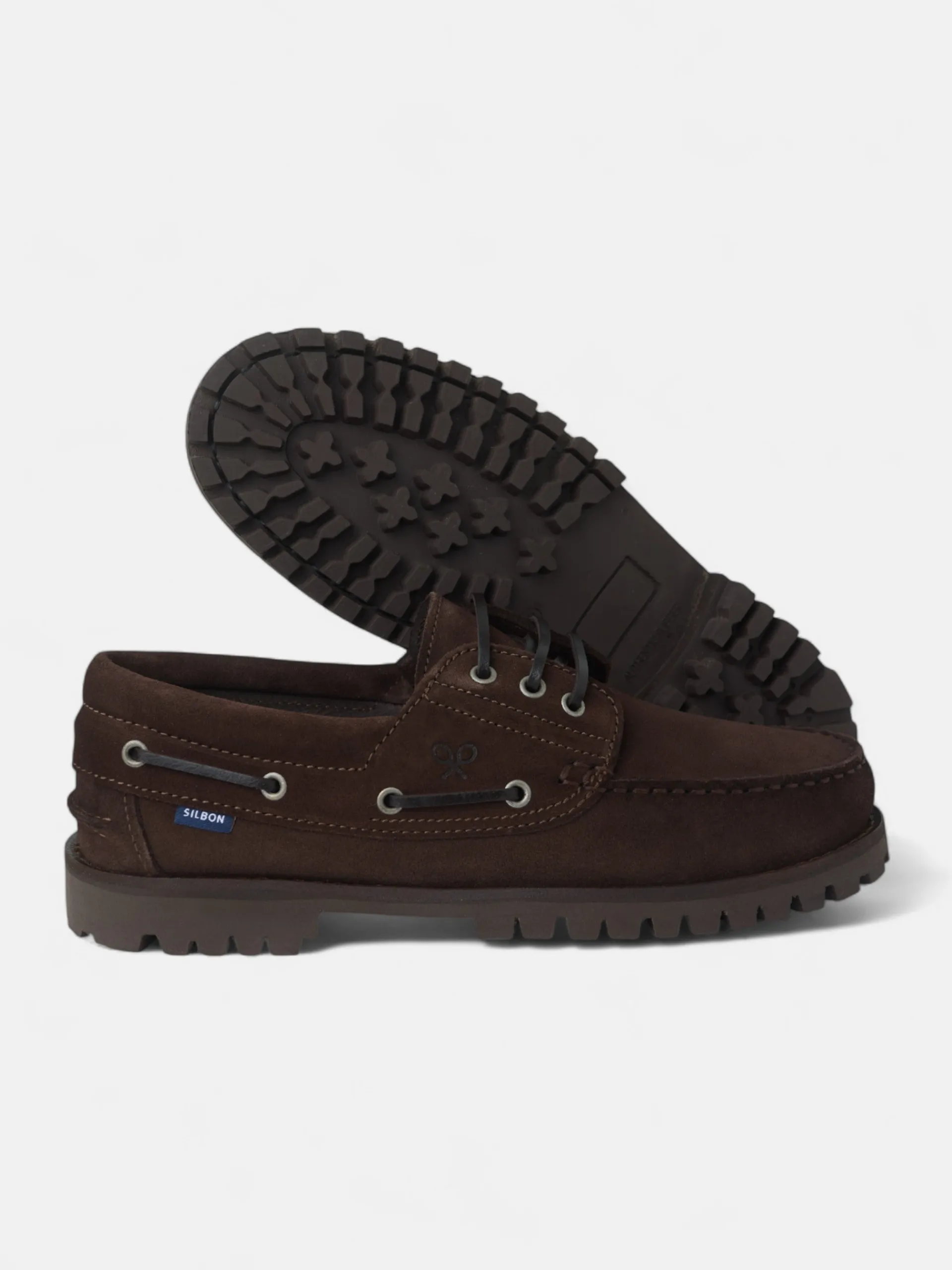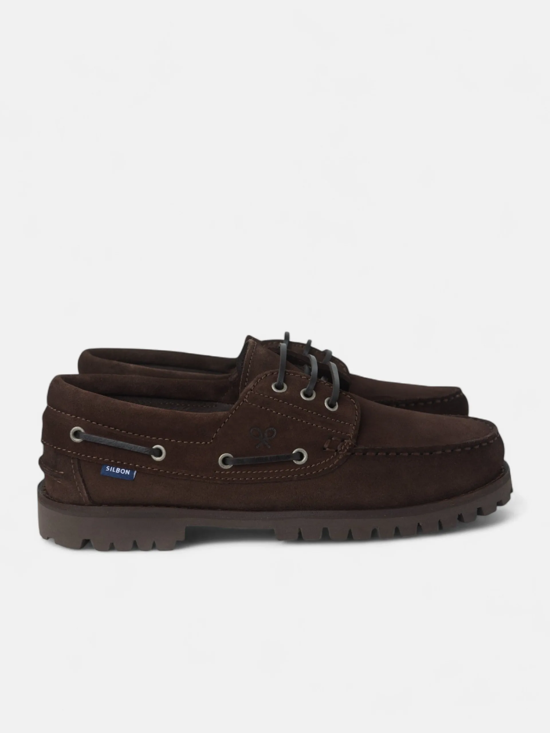 Zapato náutico serraje marrón confeccionado en 100% piel. Presenta cierre con cordones, piso de goma e interior en piel de tono marrón. Cuenta con detalle de raqueta grabada lateral. Fabricado en Portugal.
